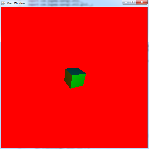 When this all ties together our original program simplies down to this: override def init(drawable: GLAutoDrawable): Unit = { val gl: GL4 = drawable.getGL().getGL4(); //Enable culling, by default only triangles with vertices ordered in a counter clockwise order will be rendered gl.glEnable(GL.GL_CULL_FACE); try { program = new FixedLightProgram(gl); cube = new Cube(gl); mvp = new PMVMatrix(); } catch { case e: Exception => { e.printStackTrace(); System.exit(1); } } } override def display(drawable: GLAutoDrawable): Unit = { val gl: GL4 = drawable.getGL().getGL4(); val blackArray: Array[Float] = Array(0.0f, 0.0f, 0.0f, 1.0f); gl.glClearBufferfv(GL2ES3.GL_COLOR, 0, blackArray, 0); program.activate(); val time: Long = System.currentTimeMillis(); val degrees: Float = ((time / 10) % 360); cube.reset(); cube.rotateXYZ(degrees, 1.0f, 1.0f, 0.0f); cube.move(0.0f, 0.0f, -5.0f); mvp.glMatrixMode(GLMatrixFunc.GL_PROJECTION); mvp.glLoadIdentity(); //90 degree field of view, aspect ratio of 1.0 (since window width = height), zNear 1.0f, zFar 20.0f mvp.gluPerspective(90.0f, 1.0f, 1.0f, 20.0f); mvp.update(); //Projection matrix gl.glUniformMatrix4fv(program.getProjectionIndex(), 1, false, mvp.glGetMatrixf()); cube.draw(program); }